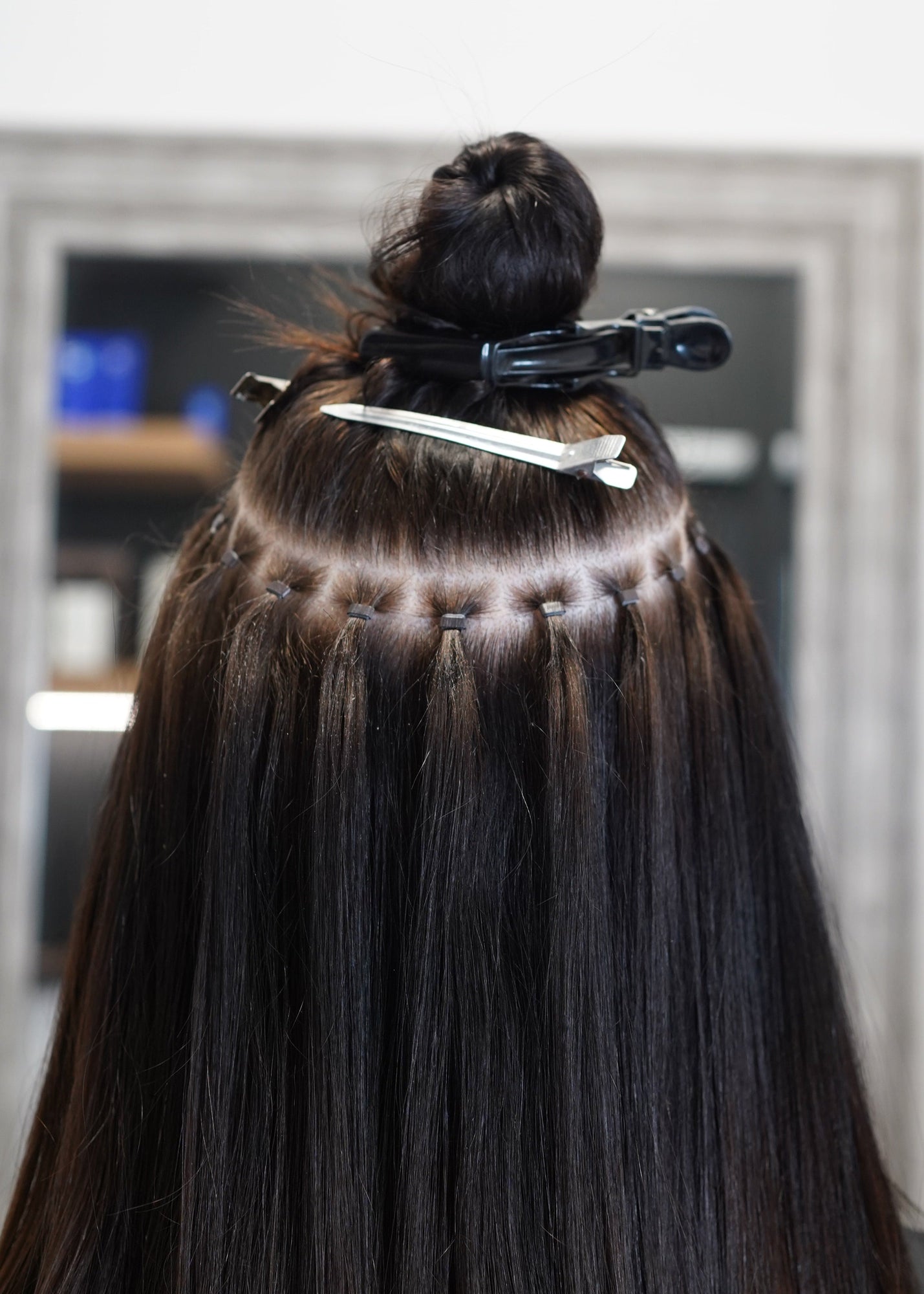La méthode par trames, cousue et maintenue par des micro-anneaux, est non-invasive et adaptée à tous types de cheveux (fins, fragiles ou denses)
